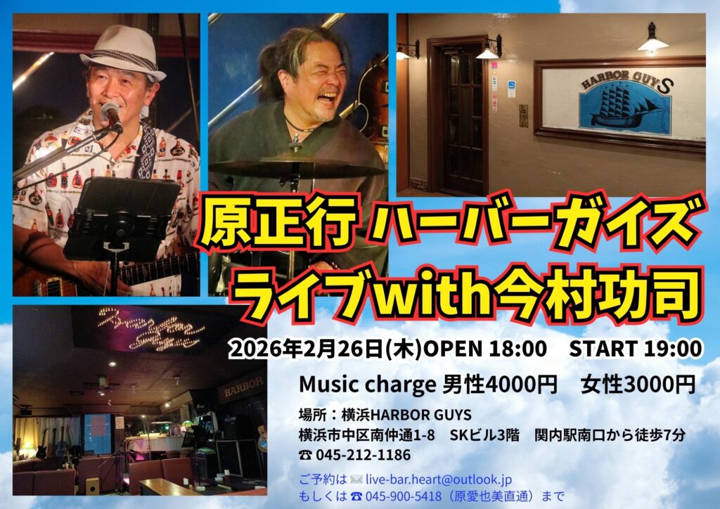 2026年2月24日(火) NEW お知らせ 2月26日(木)ハーバーガイズ出演 原正行&今村功司 2月13日(金)原正行&海保航LIVE(関内スタージスカフェ) 3月1日(日)Hey-Joe出演 ゲストVo:小野ひとみ